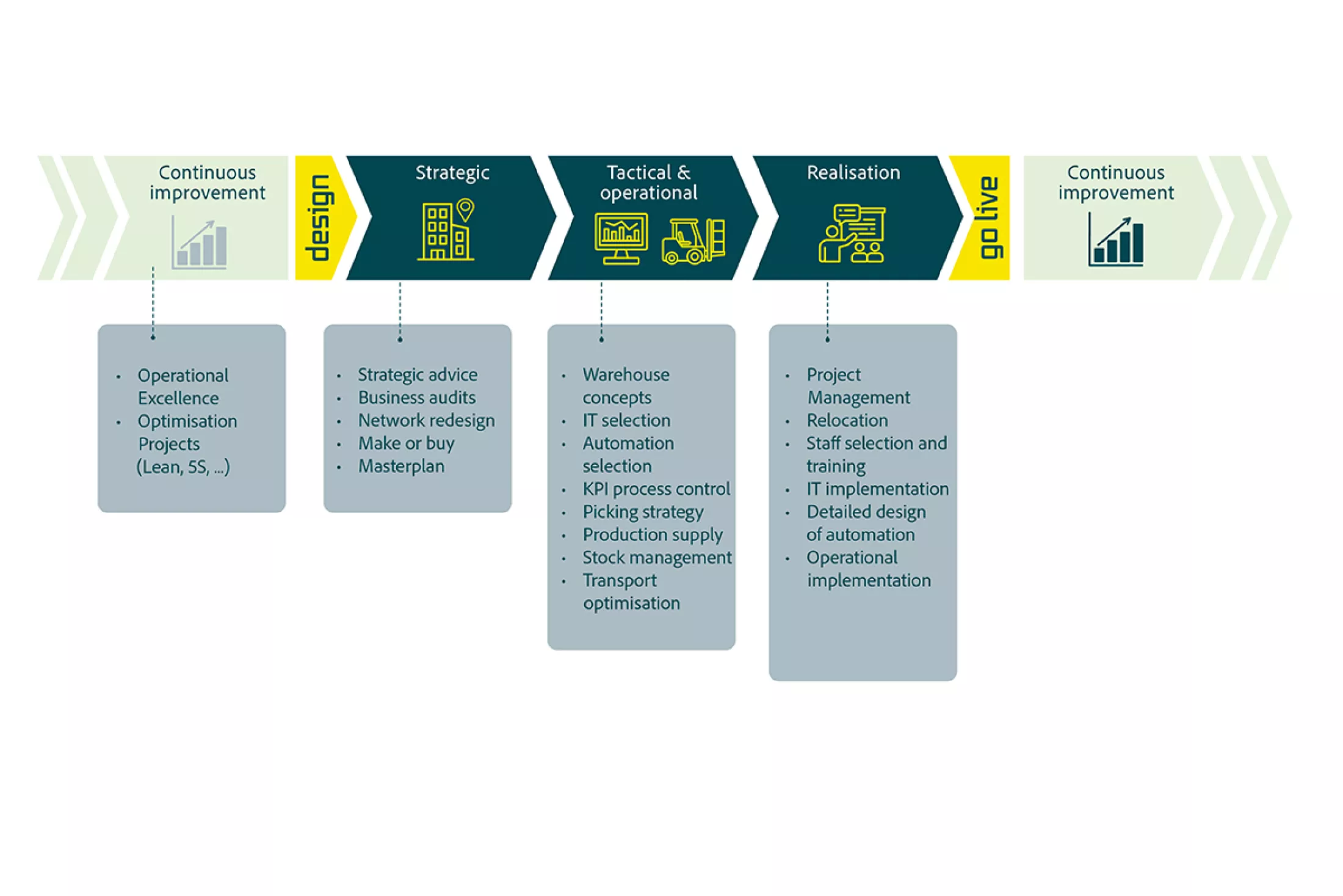Logflow has developed a business model in which we fully unburden our clients during the BPR process. The common thread in our projects is achieving 30% less space usage, while simultaneously achieving a 10 to 30% gain in efficiency.